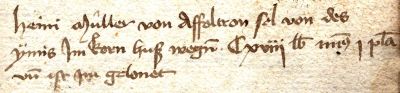 10 Heini Müller von Affoltren sol von des 11 ijmis im kornhuß wegen Cxviij lb minus j pla; 12 und ist im gelonet.