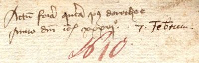 Der Dorothea wurde am 6.Februar gedacht [Heiligen-Kalender], gemäss Grotefend 1436 ein Montag. Der Donnerstag danach ist der 9. Februar. Zeile 2: (falsche) Übersetzung des Datums durch einen späteren Bearbeiters.Zeile 3: Nachträgliche Jahres-Nummerierung vermutlich aus dem 18./19. Jahrhundert.
