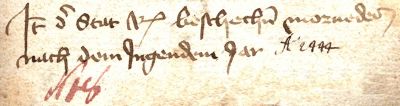 Zeile 13: Das Original trägt hier keine Jahreszahl, "1444" hat ein späterer Bearbeiter nachgetragen.Zeile 14: "N 16" = Eine spätere nachträglich eingefügte Nummerierung in anderer Schrift und Tinte.