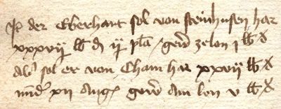 20 Item der Eberhart sol von Steinhusen har 21 xxxvij lb dn ij pla; gend ze lon j lb dn; 22 aber sol er von Cham har xxvij lb dn 23 minder xii angster; gend im ze lon v lb dn